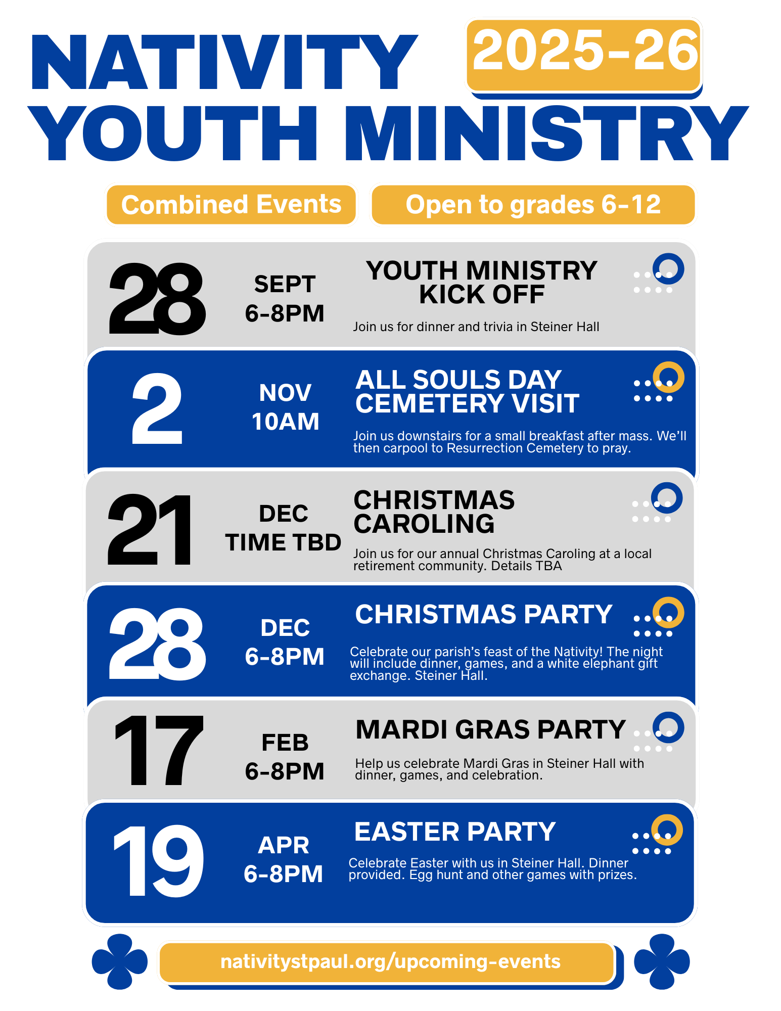 Nativity Youth Ministry Combined Events give the opportunity for our middle and high school communities to celebrate, do service, or pray together as one youth group. All those in grades 6-12 are welcome to attend and feel free to bring a friend.
