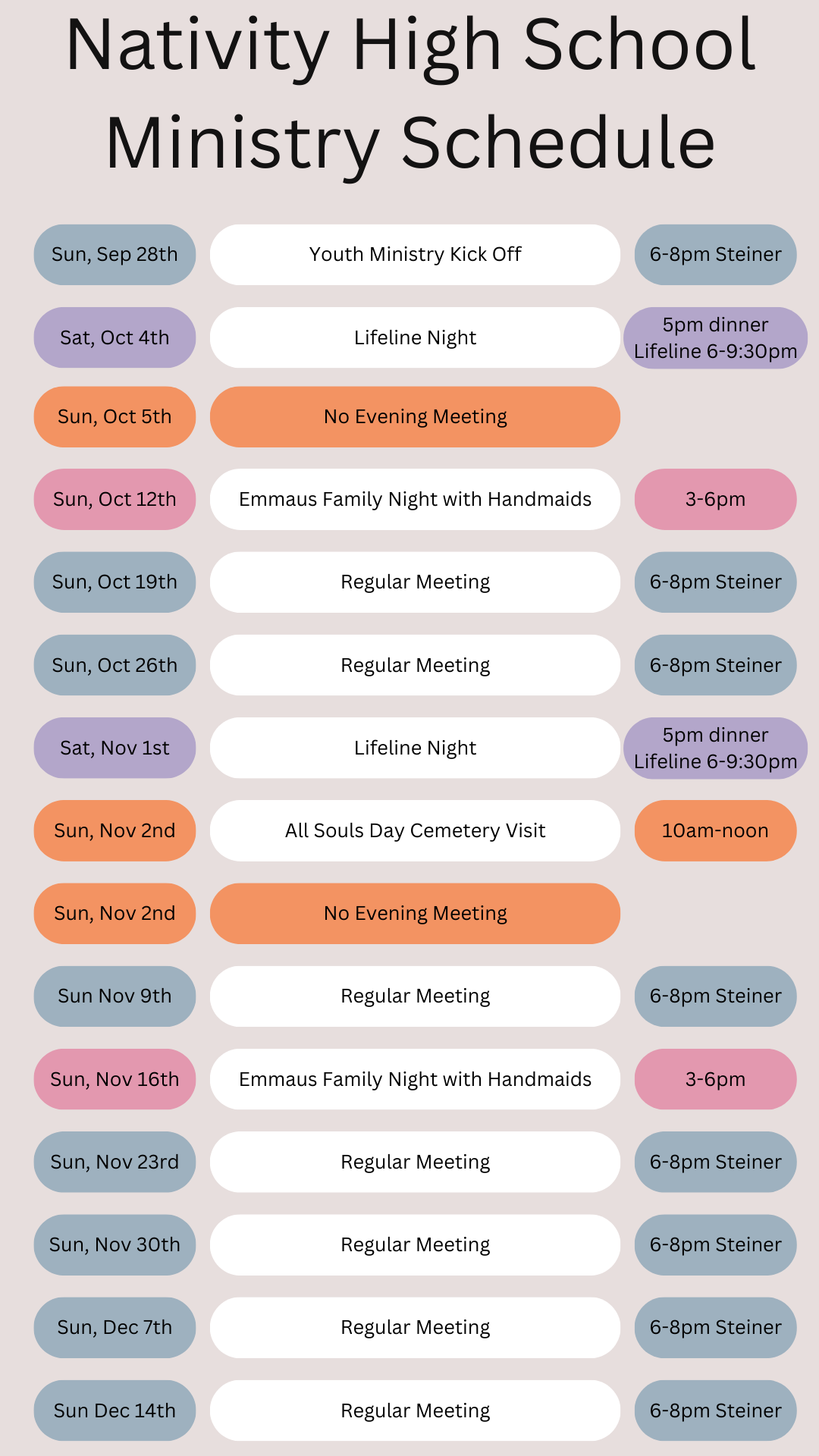 All high schoolers are invited to our High School Ministry nights on Sunday evenings. from 6-8pm. Each night will consist of dinner, games, a short teaching, discussion, and prayer. Please be sure to check the schedule below as we will not have regular meetings on weekends we attend Lifeline or have parish Emmaus nights.